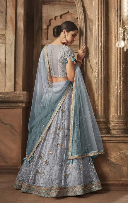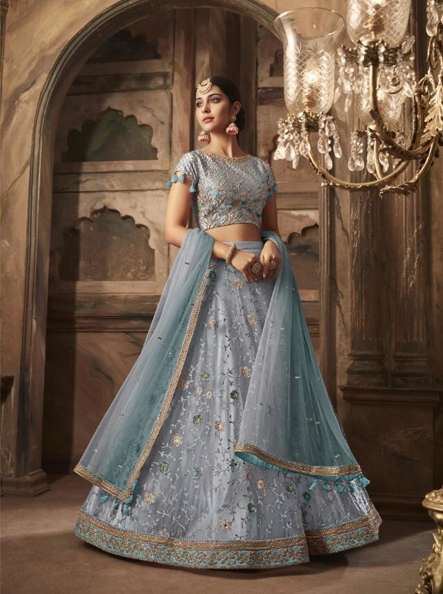 Bluish Grey Net Embroidered Lehenga